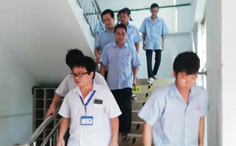 下午四點,疏散逃生演練正式開始,各部門的員工按照各車間負責人指示從安全通道及時有序撤離,及時到達緊急集合處,籃球場。