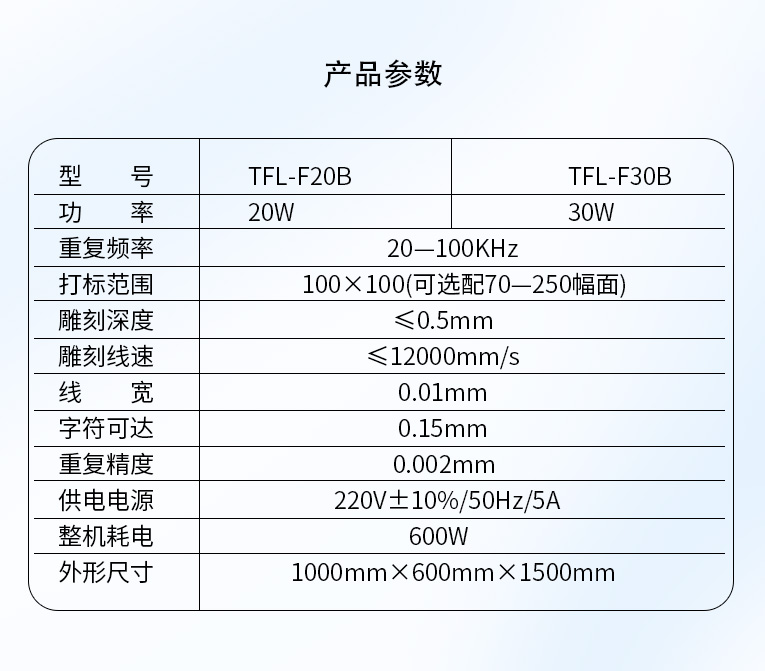通發(fā)激光研發(fā)的TFL-F20B激光打標(biāo)機(jī),金屬材質(zhì)和塑膠材質(zhì)均可進(jìn)行打標(biāo)加工。本激光鐳雕機(jī)光纖激光器、振鏡、軟件、聚焦鏡等核心配件采用原裝進(jìn)口,性能穩(wěn)定,壽命是國產(chǎn)器件的1.5倍,是高端客戶的優(yōu)選。