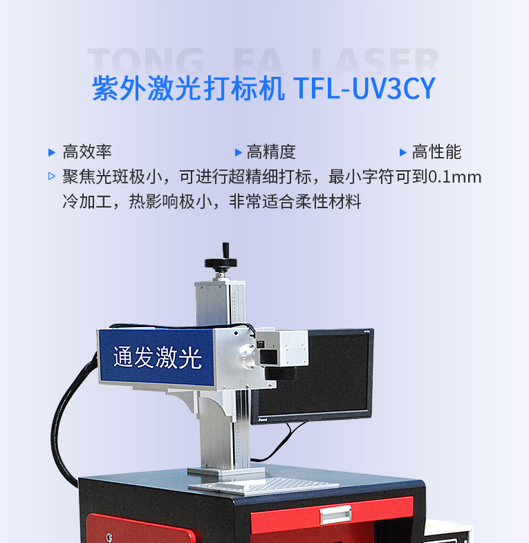 通發紫外激光打標機聚焦光斑極小,可進行超精細打標,最小字符可到0.1MM,冷加工,熱影響極小,不會有明顯燒痕,非常適合柔性材料、玻璃PCB標識、特殊材料等高品質打標加工
